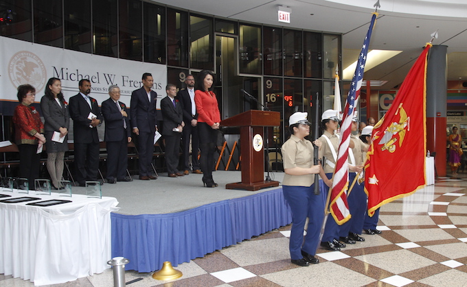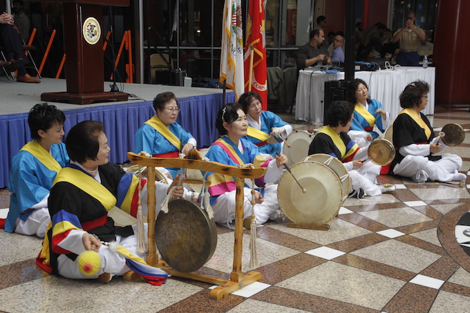 表彰大会由ABC7 华裔主播徐平主持。活动开始之际,由海军学院学生仪仗队举行隆重的插旗仪式。韩裔代表YesonYoon 为大家演唱国歌。印度舞蹈团队Anand带来了精彩绝伦的印度舞表演,最后由韩国叶林(Yelin)传统鼓乐艺术团表演传统击鼓节目。