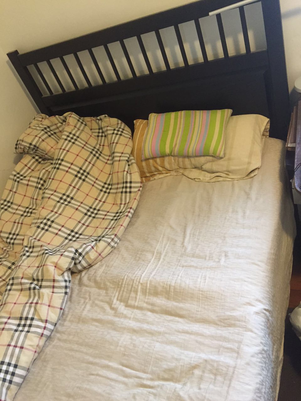 full size床架和床垫,自己在亚马逊买了个床板,三个加起来70刀吧,屋子里铁架子什么的我就和床一起送了。