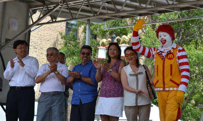 当天夏令会,还是 孩子们的游客天地,麦当劳公司推出的家庭棚区,小朋友们领取赠品,并和麦当劳大叔合影,在儿童游乐区,各种充气游乐设施也成为孩子们的天堂。本届华埠夏令会吸引的巨大客流,让华埠停车场爆满,各餐饮店生意顾客云集,生意兴旺。 (图文: