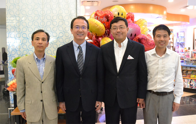 洪磊与刘军副总领事(左一)、王永副总领事(右二)、侨务组长卢晓晖领事(右一)合影