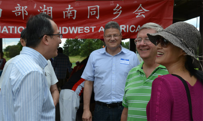 报道】美国中西部湖南同乡会暨湖南工商会,8月7日在芝加哥西北郊隆重举2016夏季野餐联谊活动, 150多名大芝加哥地区的湖南老乡与各界嘉宾欢聚一堂。作为“四分之一”湖南老乡的洪磊总领事,当天与湖南乡亲演唱《浏阳河》,让大家见识了原外交部发言人的唱功也是一流。