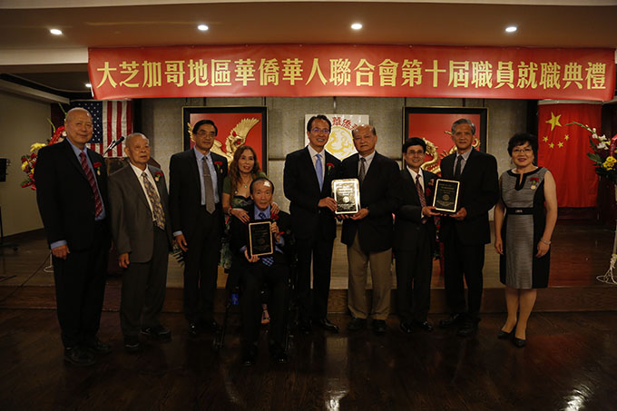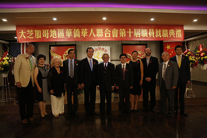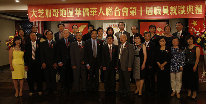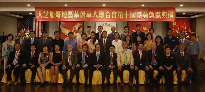 【芝加哥侨学网报道】8月27日晚,大芝加哥地区华侨华人联合会(华联会,CAAGC)第十届职员就职典礼在芝加哥富丽华海鲜大酒楼隆重举行。由华联会选举大会票选选出的第十届主席汪兴无,理事长栾文琦,名誉主席刘红,陈俊义,邱超濂,梅启珍,常务副主席赵建航,以及29为常务理事在梅法官的带领下宣誓就职。