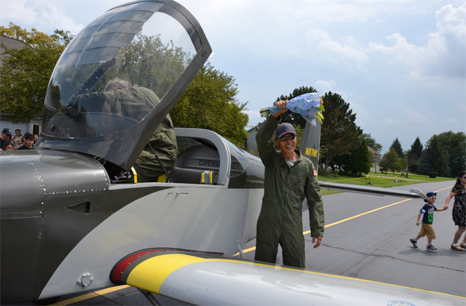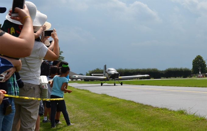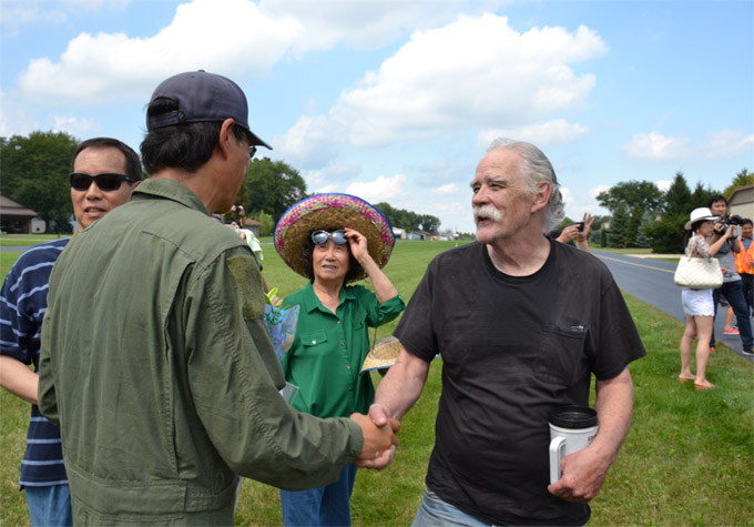 在大家的翘首企盼中,胡亮的飞机出现在天边,人群一片欢呼,与会者举起手机、相机、摄像机,记录这激动人心的时刻。胡亮在飞行教练John Musgraue的陪同下,驾驶飞机成功降落,并向亲友们挥手致谢。