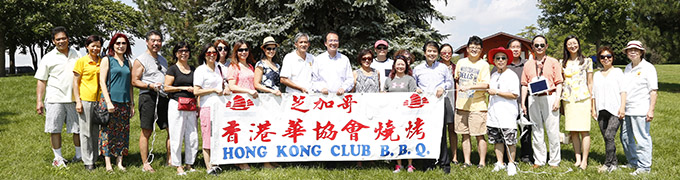 香港华协会会长赵伊龄、名誉会长朱庆龙协会成员们热烈欢迎了到场的洪磊总领事一行。赵伊龄会长表示,年度夏季烧烤,是香港华协会的传统活动之一,旨在帮助会员联络感情,并与其他侨社有人欢聚一堂共享芝加哥夏日宜人天气。