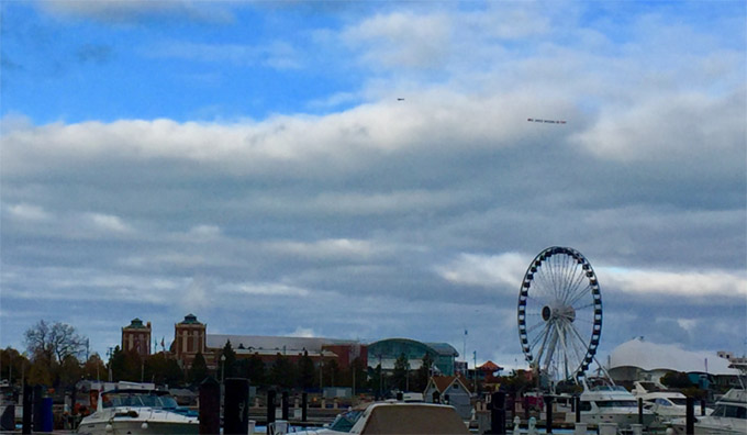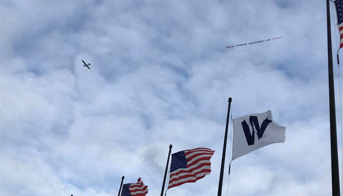 芝加哥地区的飞机横幅挺川行动,飞机从芝加哥西北郊Campbell Airport 起飞,拖着“伊州华人支持川普”的巨大条幅抵达芝加哥市中心,先后在中国城、海军码头湖畔、北城区小熊队棒球主场Wrigley Field上空来回盘旋近两个多小时。飞机在小熊队主场盘旋的时间,正好是小熊队决赛期间,观众人数众多。