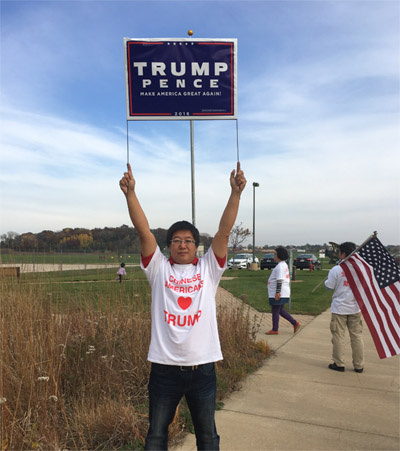 蒋勇是旅美中国科学家工程师专业人士协会麦迪逊分会会长,他表示,包括他自己在内的挺川华裔人士,非常不认同民主党政策,包括最近的同性恋婚姻、跨性别厕所法案,AA平权法案(按族裔人口比例分配大学入学招生的族裔比例),与华人价值观违背。我们应该倡导依靠勤奋的工作创作美好生活,而不是靠政府福利去养大自己,法律与法制的尊严,一个社会的基本道德观、价值观是不容破坏的。