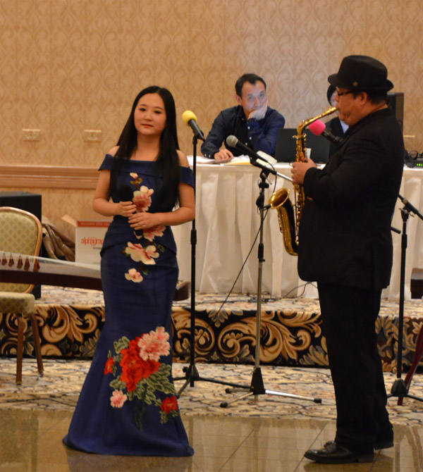 晚会的压轴节目,是由中国旗袍会芝加哥分会会长王坚、执行会长戴新共同参与的表演唱《冰糖葫芦》。作为女性团体中耀眼的男会长,王坚为节目们民国风时装表演的衬托下,为大家一展歌喉,全场掌声热烈。