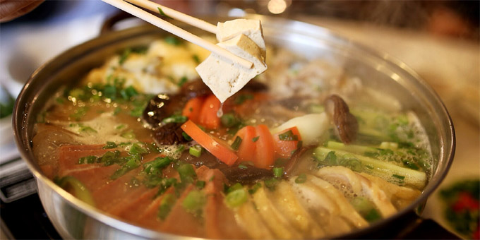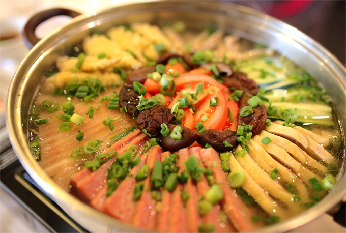 初见这道菜,暗自惊喜。圆圆一锅,各类菜品码成一圈,整整齐齐。金黄色的是小鳕鱼酥;走地鸡色泽光润,乳白的鸡肉与嫩黄的皮浸润在汤中;粉色的是午餐肉;米白色的猪肚;半透明的五花肉;中间是一圈肥嘟嘟的冬菇,环绕着殷红的番茄片;嫩绿的小葱花再细细撒在面上。与其说是一锅食物,不如说是一顿安妥与满足。掀开表面这些,里面还隐藏着更多。白萝卜炖到微有通透,鲜笋与豆腐的搭配妙如神仙眷侣,腐竹吸满了汤汁,饱涨着满身鲜香。