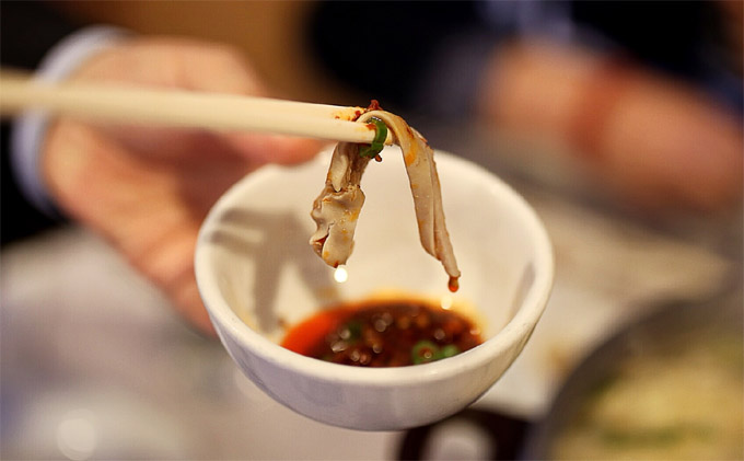 不同于市面上流行的四川火锅,彭祖漂汤本身没有辣味,凭喜好自己蘸辣味调料而食。吃法是这样的,上桌后烧开,开始温柔敦厚地冒泡后,盛一碗汤来喝,再慢慢夹锅内食材,蘸调料来吃。先讲汤,汤是特制高汤熬的,香浓到匪夷所思。汤的香气几乎要聚集成半固体,可以放在手心里舔着吃。