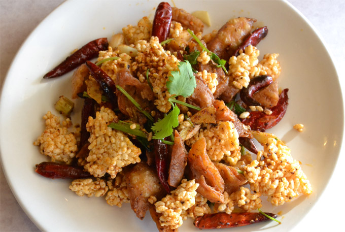 优质大米制作的锅巴,外焦内嫩的肥肠,辣椒,老四川秘制香料,大火翻炒,特级川菜大师为您谱写的美食交响曲。炒完出锅,稻香满堂,香辣酥脆,一定是全桌的惊喜,垂涎欲滴。