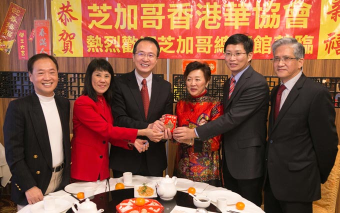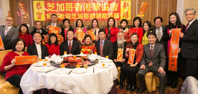 中午,总领事一行人与芝加哥香港华协会在南华埠的万濠酒楼进行午宴,共贺农历新年的到来。香港华协会会长赵伊龄在午宴上致辞,她首先感谢了芝加哥总领馆对香港华协会的支持。并表示在新的一年里一定会继续不遗余力地支持“一国两制”支持祖国繁荣昌盛。赵会长还特意提到了2017年是香港回归20周年,香港华协会一定要与总领馆一道,筹备、组织好庆香港回归20周年纪念活动。