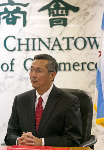 总领事一行人,当日下午的第一站选在了芝加哥华商会。华商会会长徐佐寰(Tony Shu)代表华商会全体同仁热力欢迎洪磊总领事一行人的来临。徐佐寰会长表示,华商会一直与总领馆保持着良好的关系。在新的一年里,华商会希望继续与总领馆合作,为吸引华埠投资、让社区商业、生活更加繁荣作出努力。