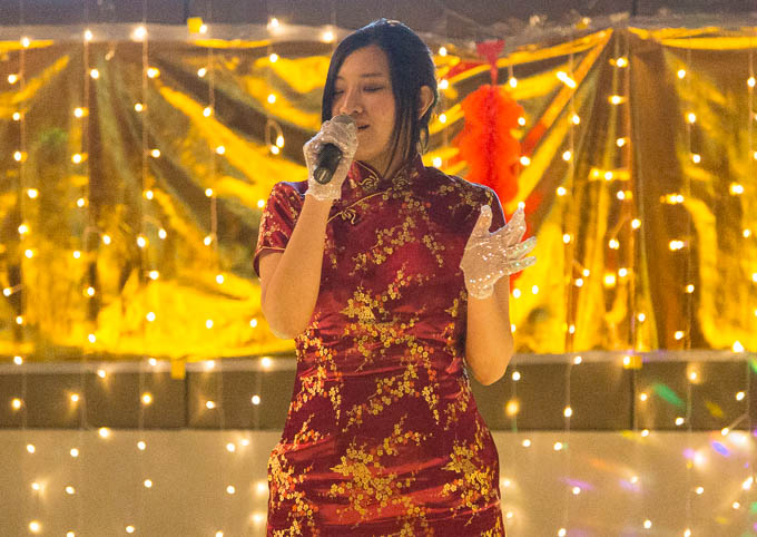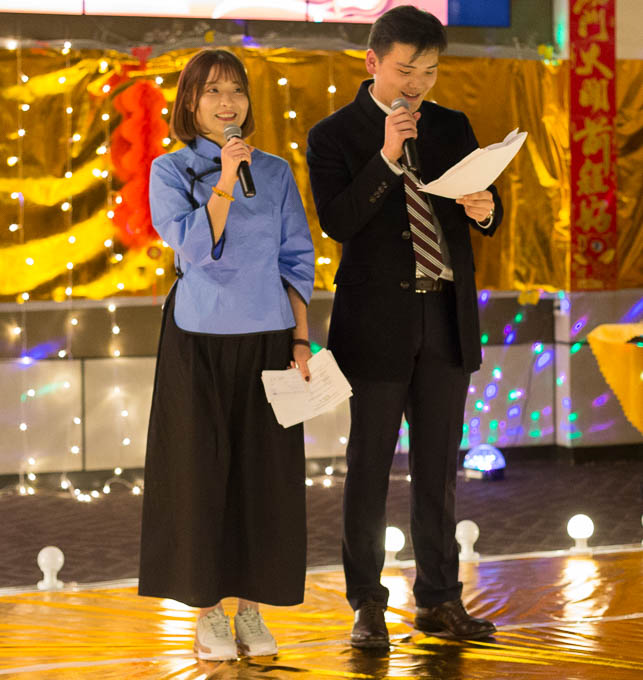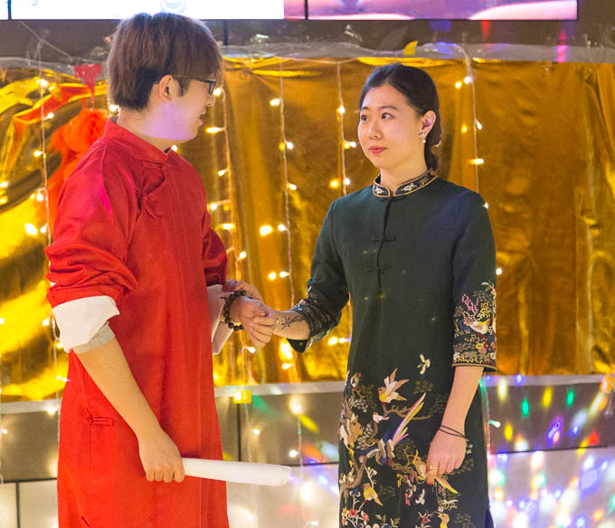 位于洛约拉大学市中心校区的CLC Kasbeer宴会厅内被装饰得流光溢彩、奢华典雅。夜上海风格的T型舞台在宴会厅中央延展出来,背后装点着金色的彩灯与喜庆的灯笼对联。整个宴会厅独具夜上海百乐门气质与红红火火的新年氛围。来访者身着民国主题服饰。男生西装意气风发,女生旗袍美轮美奂。主办方还特意布置了红地毯和拍照环节,为同学们记录下了最美丽的瞬间。步入宴会厅内,仿佛穿越到了民国的光金时代。