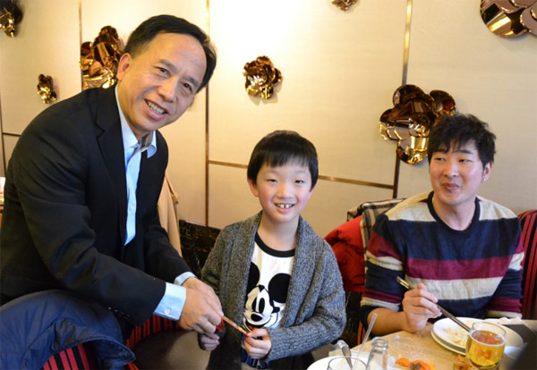 新泰门窗总裁雷正明(左一)向小朋友发红包