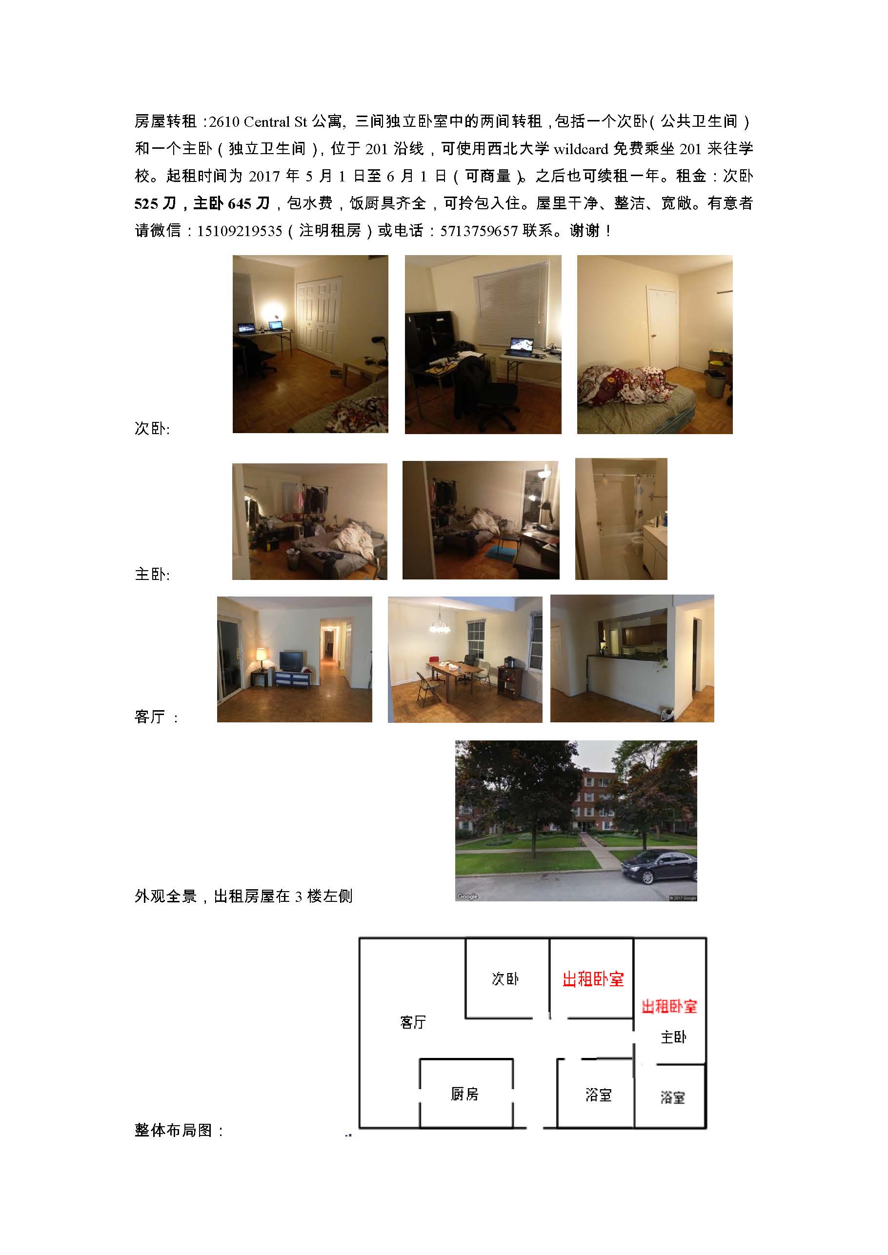 房屋转租:2610Central St公寓, 三间独立卧室中的两间转租,包括一个次卧(公共卫生间)和一个主卧(独立卫生间),位于201沿线,可使用西北大学wildcard免费乘坐201来往学校。起租时间为2017年5月1日至6月1日(可商量)。之后也可续租一年。租金:次卧525刀,主卧645刀,包水费,饭厨具齐全,可拎包入住。屋里干净、整洁、宽敞。有意者请微信:15109219535(注明租房)或电话:5713759657联系。谢谢!