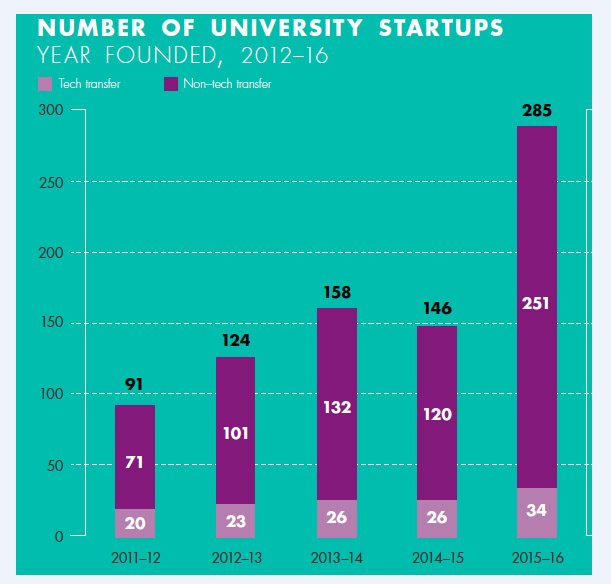 从自助创业的类型来看,去年只有12%的公司选择了学校的科技开发项目,更多的人在自主创新个人的企业项目。其中,技术转移相关公司(tech-transfer companies)在过去五年增长了70%,为比较热门的创业点。
