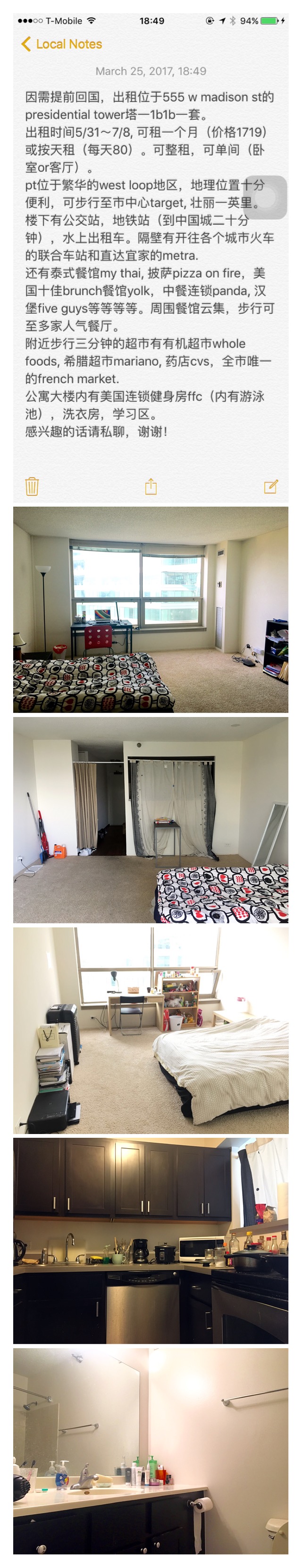 因需提前回国,出租位于555 w madison st的presidential tower塔一1b1b一套。