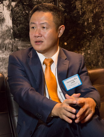 广州医药集团有限公司总经理助理黎洪(左)介绍广药集团