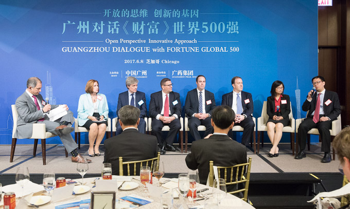 在推介会的最后阶段还举行了题为《开放的思维 创新的基因》的嘉宾对话,来自广州医药集团有限公司的总经理助理黎洪与来自沃尔格林,波音,宜瑞安等多家总部设在芝加哥的跨国公司高管进行了对话,针对如何建立全球化贸易中心,未来医药医疗产业等话题进行了讨论。