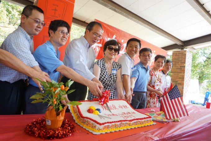 中国驻芝加哥总领事与嘉宾和组织者一起切下祝福的蛋糕