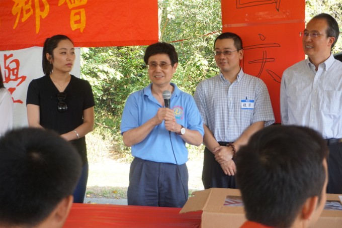 江苏同乡会会长程思(左)与江西同乡会会长娄瑞明(右)带领义工们分发美食