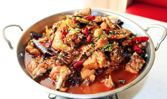 重庆方言管“公鸡”叫“鸡公”,所以是重庆烧鸡公。这道巴蜀名菜,最先出自于重庆的璧山县,据说是一帮司机哥们出了一趟长途车,饿得如狼似虎,好不容易看见前不着村,后不着店的地方有一家饭馆,上前一问老板都关门了,什么也没有了,说尽好话,老板只好将就把自己养的鸡宰了,又加了大量的辣椒和香料,还有剩余的火锅底料一起烧,没想到这一烧,就烧出了一道名菜。