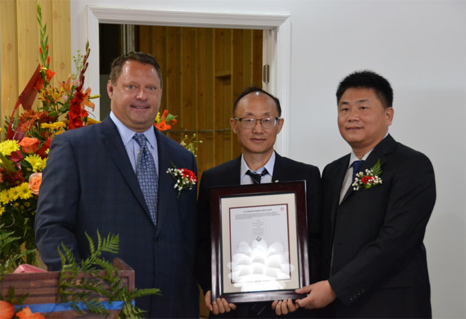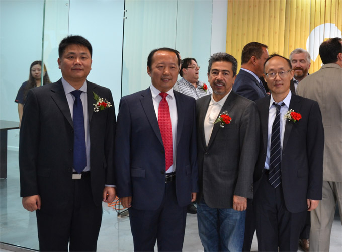 嘉宾合影,左起:格力欧阳俊、芝加哥总领事馆淡远鹏参赞、芝加哥25区区长Danny Solis, 光华建材首席执行官George Gao