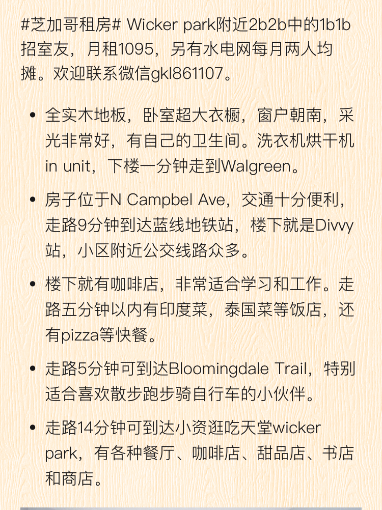 房子位于芝加哥wicker park附近的居民区,安静安全,交通十分便利,适合每天commute去downtown上班上学的小伙伴。是2b2b,现在出租其中的一间卧室和一间卫生间。具体信息和联系方式请看下面的图~