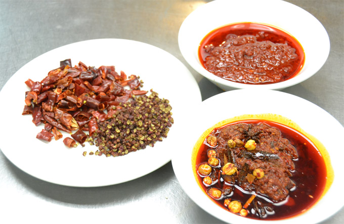 成都烧鸡公的三大调味品展示,均是麻辣诱惑餐厅从四川原产地空运而来