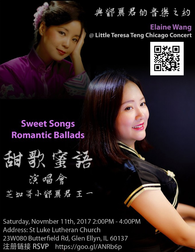 芝加哥侨学网报道】11/11号下午,在芝加哥西郊的Glen Ellyn将举办一场芝加哥小邓丽君——王一的个人演唱会。王一将带领芝加哥优秀的歌手以及乐手为大家呈现邓丽君经典歌曲以及全新的改编歌曲。据消息来源,在短短不到24小时,所有的票都订空,这也是芝加哥演唱会上史无前例的。