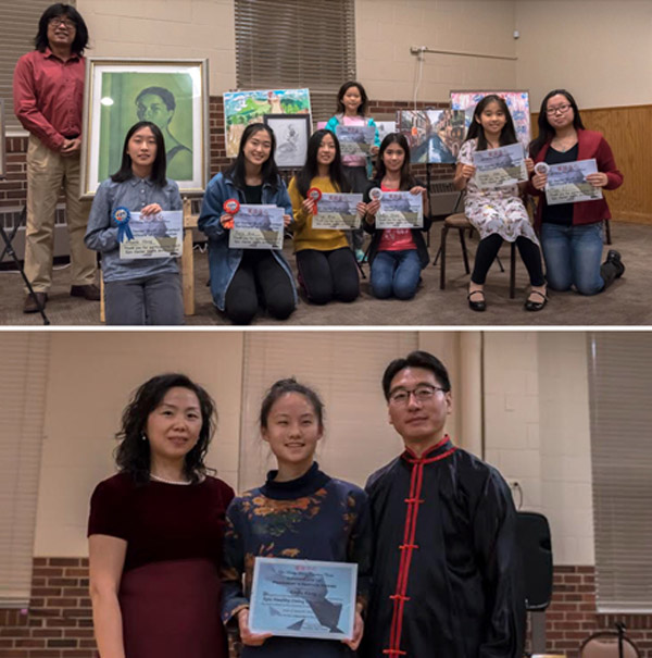 爱培中心艺术指导张信颁发第四届青少年绘画竞奖,12岁以下三位小朋友获得鼓励奖,Amelia Du 8, Lucylar Chen 9, Angela He 11; 12-14岁年龄段, 3rd place Angie Chang 12, 2nd place Olivia Qian 13, 1st place Amanda Huang 14; 15-17岁年龄段, 3rd place, Tina Li, 15, 2nd place Dora Guo, 16,1st place, Allison Tong, 17。小朋友们得到奖状奖章和奖金。接下来爱培中心负责人刘亚亚博士颁发给Emily Kang首位爱培青少年总统服务奖颁奖。