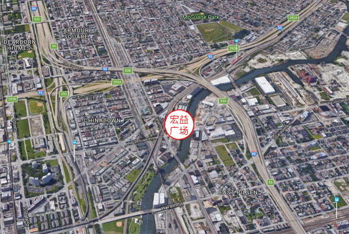 宏益广场(465 W.Cermak Rd),从中国城人气最旺的华埠广场出发,步行5分钟内即可抵达。从宏益广场开车,2-3分钟可上55、290、90/94高速,交通便利。宏益广场包括总建筑面积27万平方尺的宏益广场大楼、楼前广场、南区附楼、周边停车场近400停车位,总占地面积达3.5英亩,未来还规划增加停车楼。宏益广场的主体建筑宏益大楼,是一栋具有百年历史的芝加哥地标性建筑,总建筑面积27万平方英尺,楼高五层,还有一层半地下,每层楼均为4.5万平方尺。