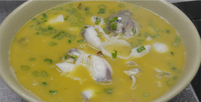 重庆酸菜活鱼的汤底,由炒料加入老母鸡熬制的高汤而成,然后放入鱼骨继续炖煮