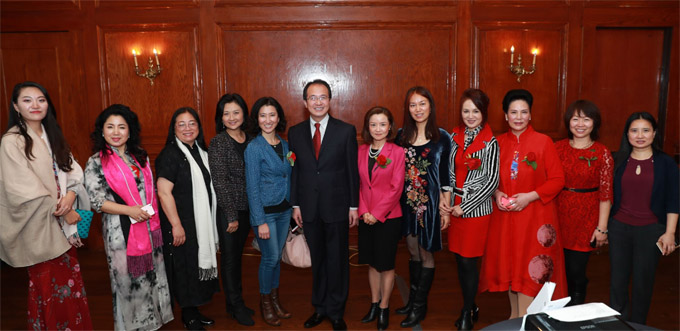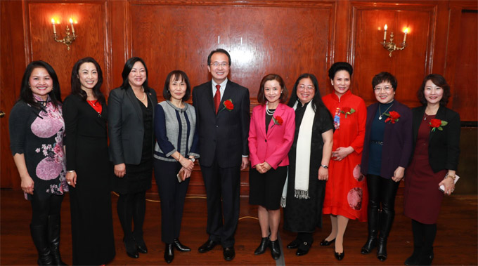 与会嘉宾与洪磊总领事(左五)、伊州首位华裔议员马静仪(左三)合影留念