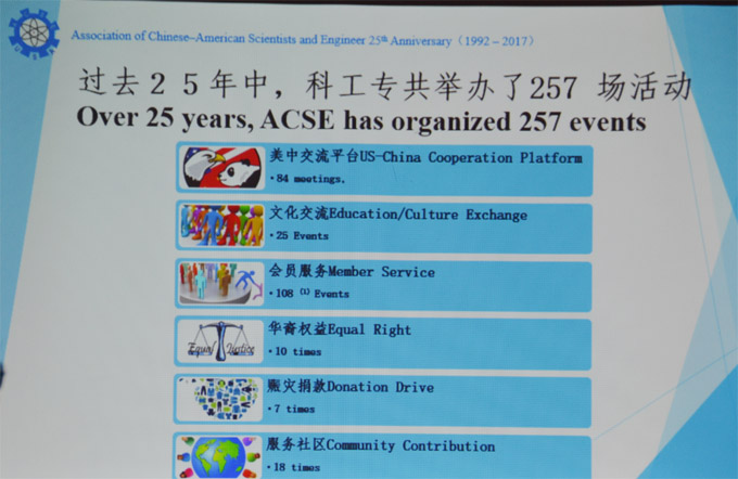 在当天活动中,科工专前会长郭海波、倪陈平、王涛、梁琨、徐向东,分别以不同的主题,介绍了科工专25年发展成长的方方面面,历数科工专自成立以来在大事。据悉,科工专自1992年成立以来,由一个当初仅有43人的小组织,成长为如今拥有数千名华裔科学家、工程师、专业人士会员的大型协会。25年来,科工专秉持“走出去、请进来”的理念举办了257场活动,主要涉及促进中美友好合作和会员服务两大领域,25年来科工专还在维护华裔权益、赈灾捐款、服务社区等领域也是卓有建树。