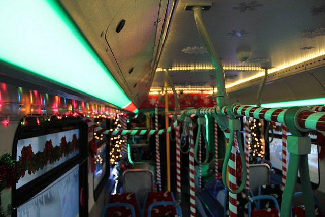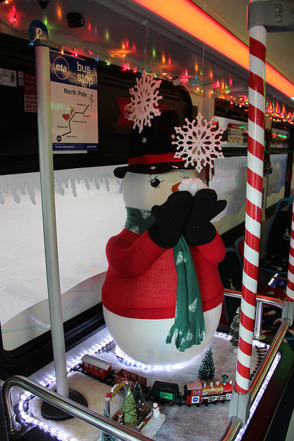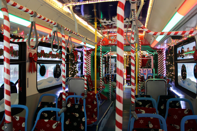 除了圣诞专列外,CTA巴士也已推出了圣诞巴士,今年的圣诞巴士的主题装饰以驯鹿、雪橇装饰为主题,驯鹿的鹿角还会在车顶伸出,形成3D效果。整个车身和车内由圣诞主题的彩灯装饰,圣诞老人还会在预定的时间光临巴士与乘客合影。