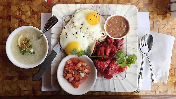 仅售9.95美金的菲律宾式早餐包含一个烟熏的独特风格猪肘肉,两个鸡蛋和一份蒜香薯条,还可以选择一份菲律宾风格的粥,是在菜单上找不到秘密单品。