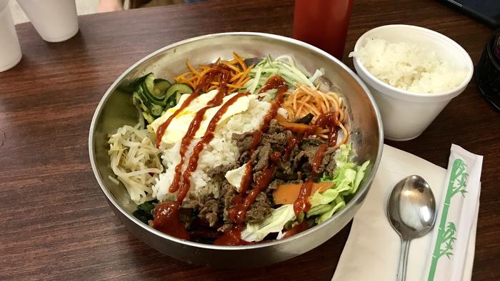 经典的韩式拌饭,价格仅为8.99美金。虽然价格不高但是食材却十分丰富,一大份牛肉,搭配胡萝卜,豆芽,黄瓜,鸡蛋和各种蔬菜,搭配韩式口味的辣椒酱拌在一起,是一份物美价廉的午餐。