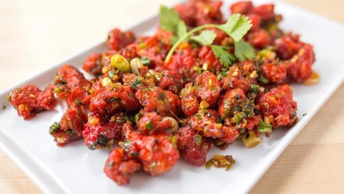 Manchurian caulifower是一道印度风格中餐,由姜黄和辣椒酱烹饪出橘黄色的花椰菜。口感酥脆,搭配青椒和青葱,口感独特。