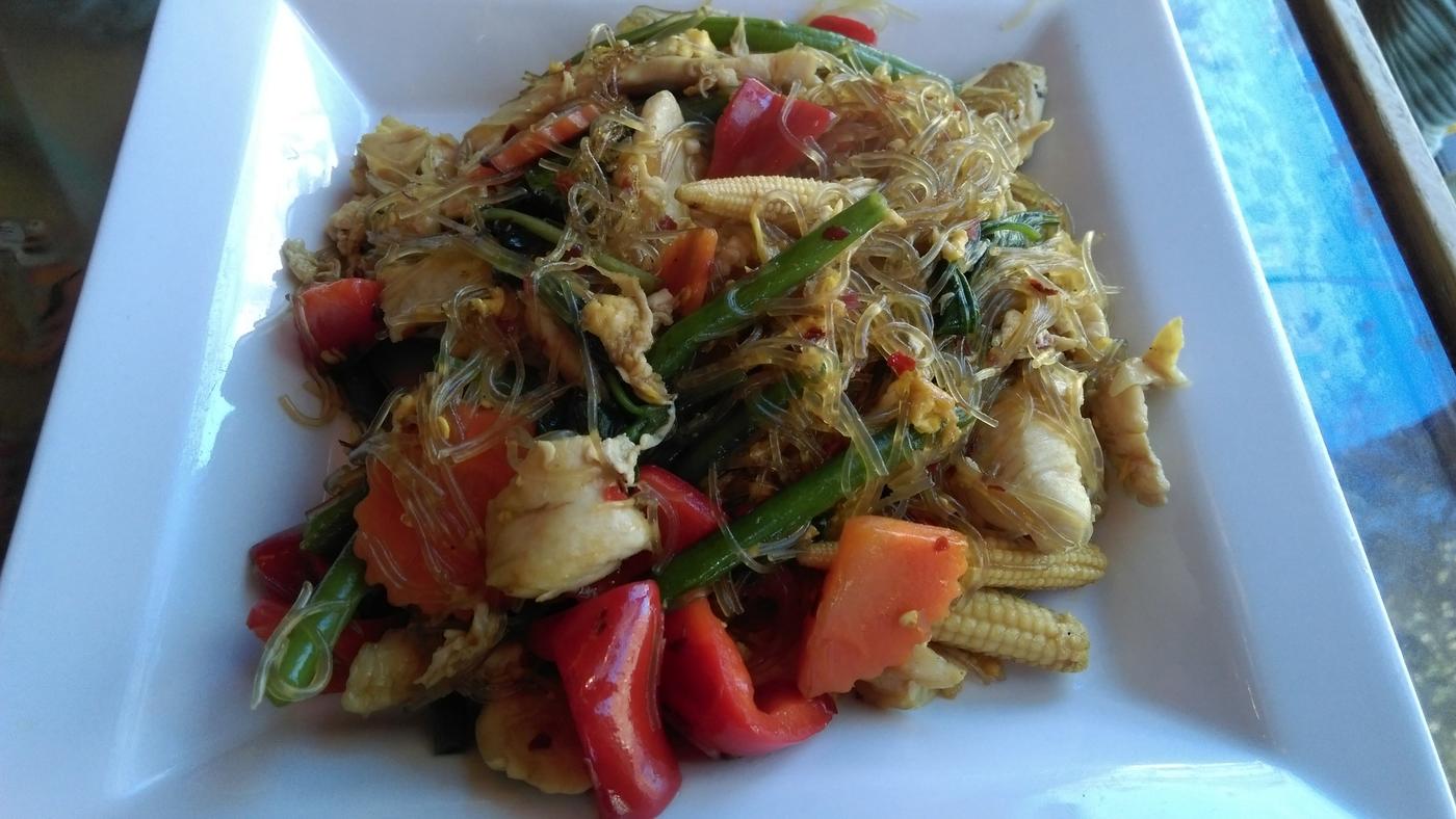 woon sen khee mao是一款食材极其丰富的选择,包括胡萝卜,红椒,绿豆,小玉米等多种蔬菜,配上炒粉丝,还可以升级搭配鸡肉或者虾仁。