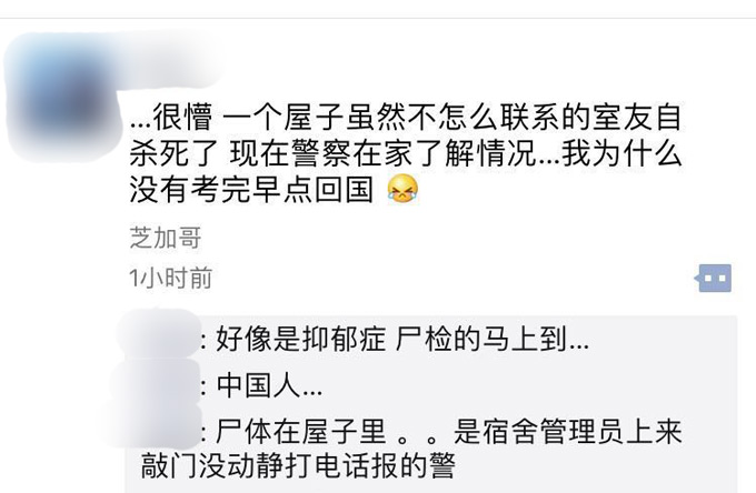 据悉,这则消息是在圣诞节前夕12月18日左右发布的,发消息的人表示自己回到宿舍后发现屋内有警察,随后得知自己的室友或因自杀已经身亡。消息发布者还表示,虽然自己与死者为室友,但平时很少交流,还怀疑死者可能患有忧郁症。消息发布者描述,是学校的宿舍管理人员在敲门无人应答后选择报警,警察到来后发现死者已经死亡。