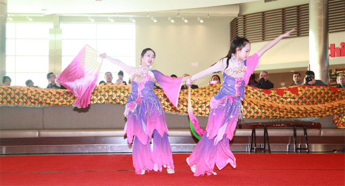 芝加哥黄河艺术团的何菲菲、唐娜表演扇舞