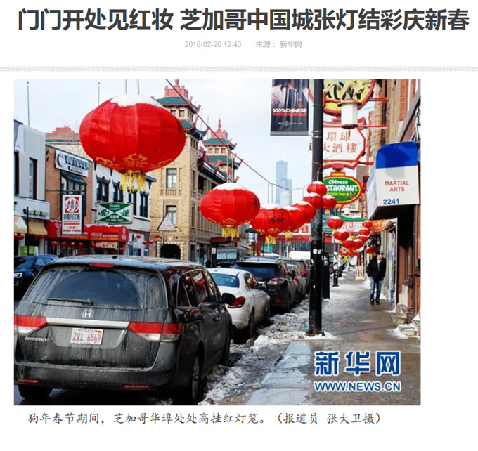 2018春节期间,芝加哥中国城随处可见的大红灯笼,不仅得到了商家业主、居民的广泛赞许,还引起新华社的关注