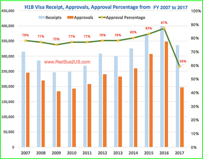 川普元年的H1B获批率为近10年最低 (图片来源:网络)