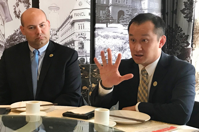 华咨处总裁刘国华(Paul Luu)(右)与总监潘直理(Jered Pruitt)(左)接受记者采访