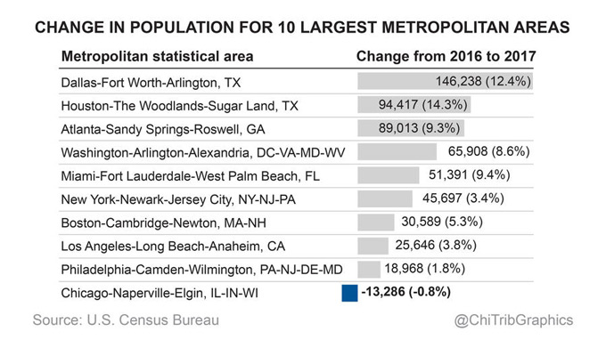 【芝加哥侨学网编译】根据美国人口普查局最新公布的数据,2017年约有1.3万人搬离大芝加哥地区,这是大芝加哥地区连续第3年人口减少。在美国人口最多的十个大城市,芝加哥地区是唯一人口持续减少的大都会区域。而在美国西南部地区,人口则出现明显增长,2017年德州达拉斯、休斯顿成为美国人口增长最多的两座城市。