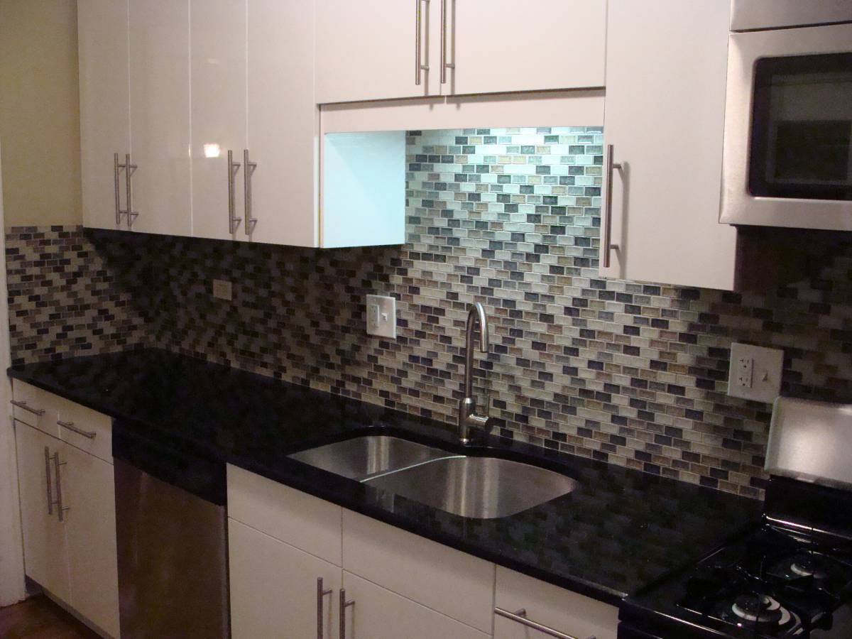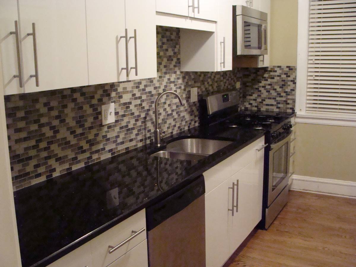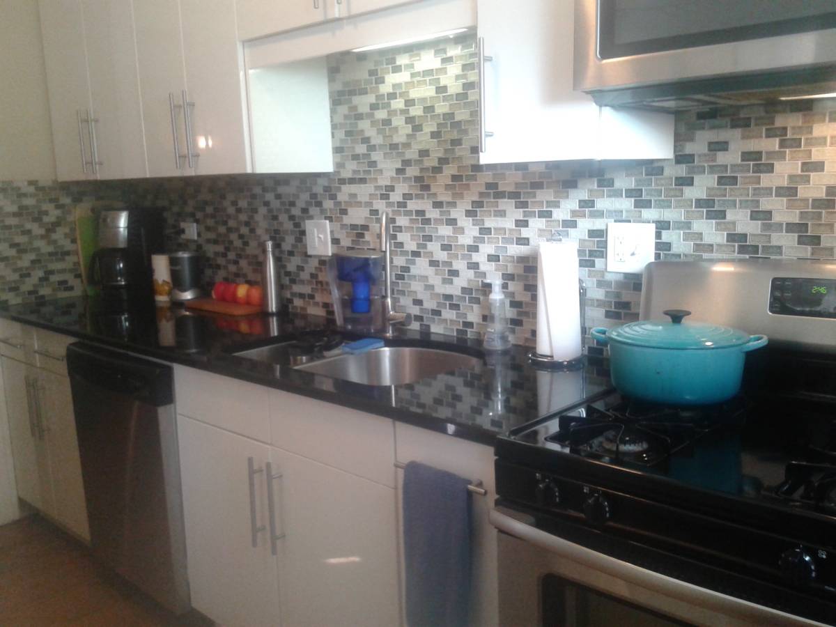 Modern kitchen with granite counters, tile back splash, newcabinets, stainless steel stove, microwave and dishwasher.