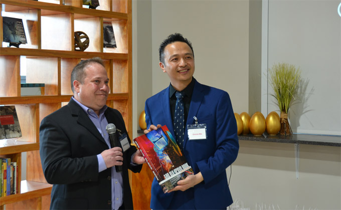 Josh Grodzin向Gavin Ma 赠送Elk Grove市宣传册,祝金牌橱柜生意兴隆,促进当地经济繁荣与就业发展