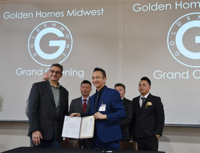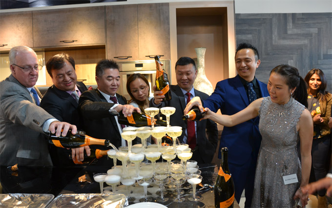 当天,金牌橱柜美中中心仓还隆重举行签约合作仪式,与大芝加哥本地的家居装潢业主达成商业合作协议。各界与会嘉宾一起开香槟,庆祝芝加哥金牌橱柜经销中心开业剪彩开门红。