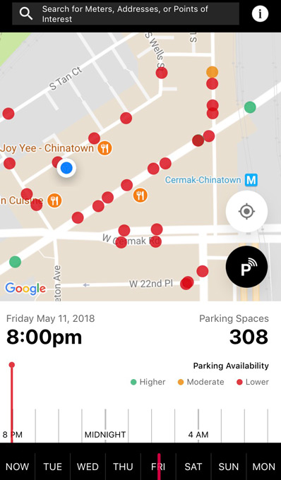 芝加哥侨学网编译】在芝加哥市区停车经常是一位难求,能否预先知道哪里有咪表停车空位?由芝加哥咪表停车公司推出的芝加哥停车地图(Park Chicago Map)的手机应用堪称神器,会分析以往的咪表使用大数据,未卜先知,告知你的目的地附近那个地方最有可能会有空余咪表车位!
